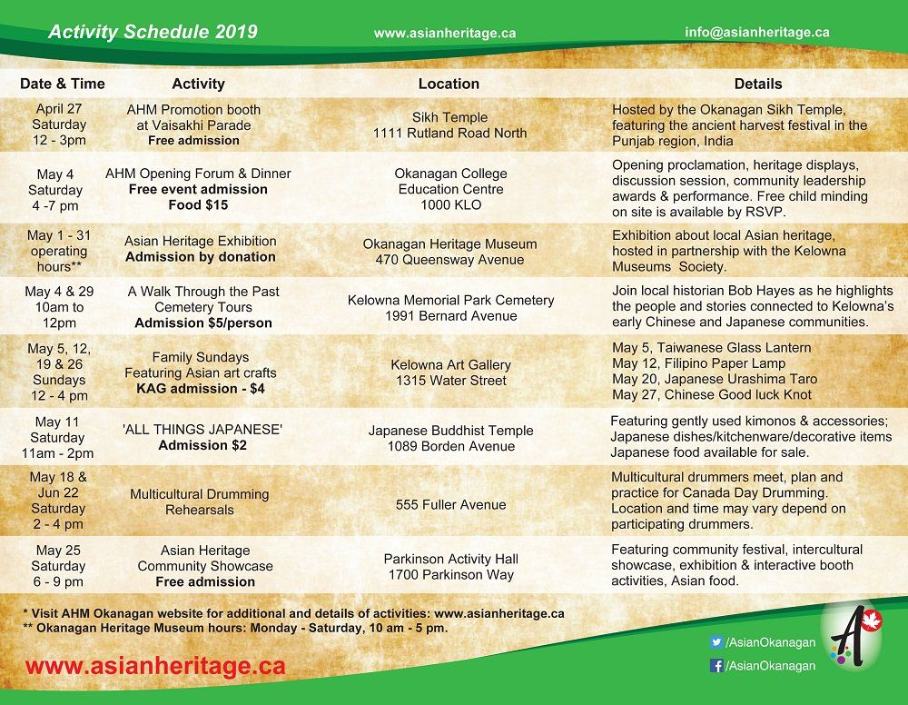 May is #asianheritagemonth. Here are some of the activities happening around the #okanagan to celebrate Asian contributions to Canada Learn more at: