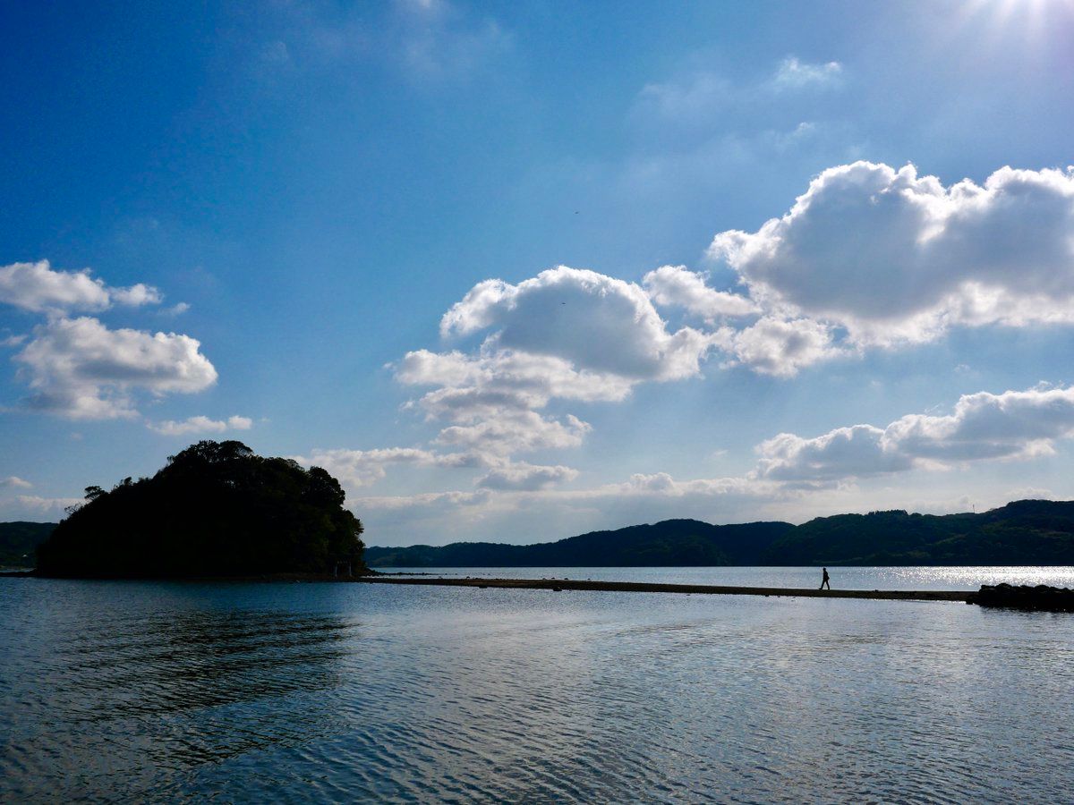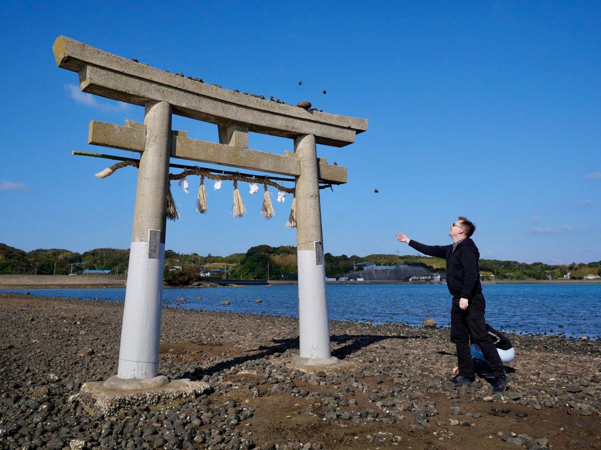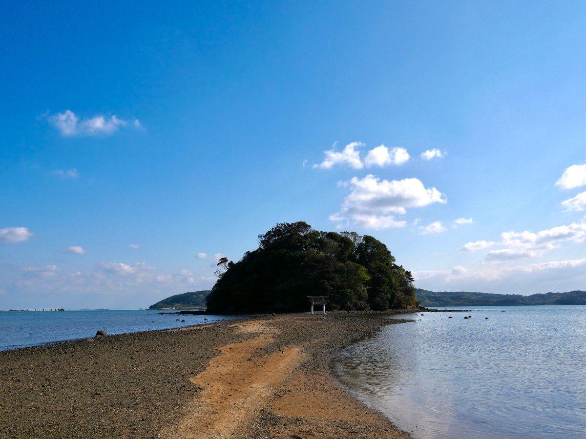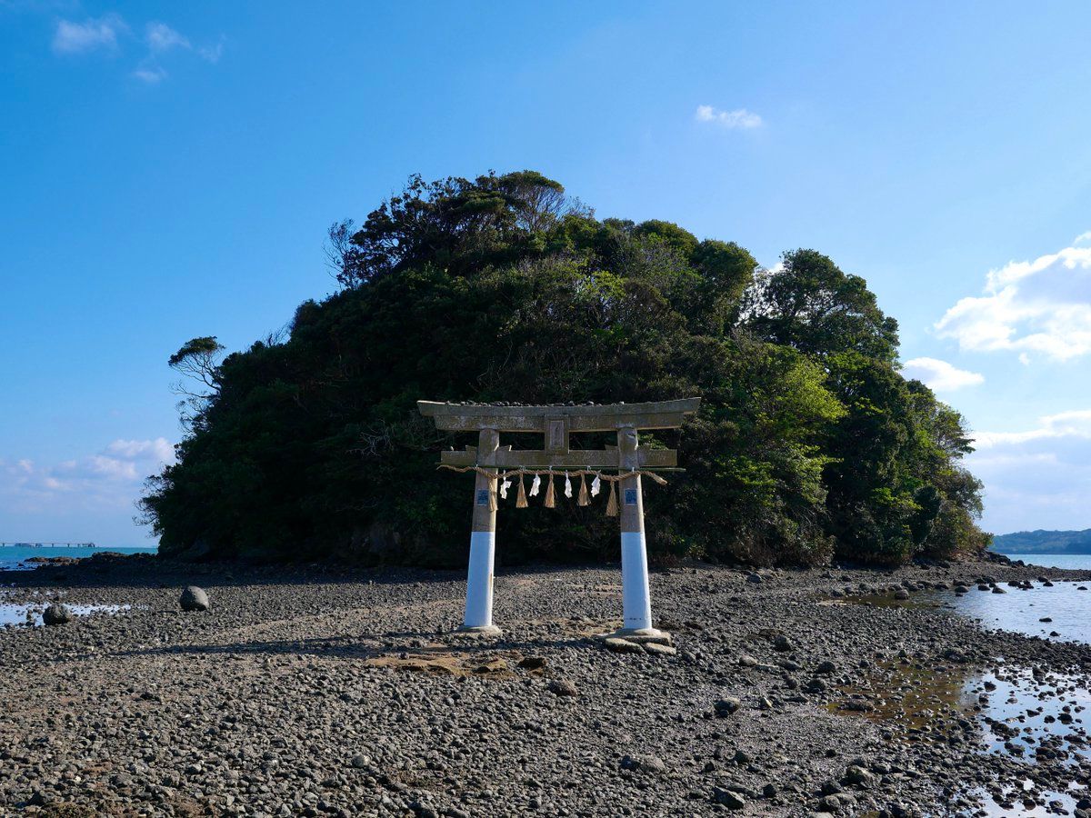 While the tide was low we walked out to Kojima Shrine. You can see where the water comes up to at high tide. We took a moment to (successfully!) throw a rock on top of the torii ⛩️ for good luck! #ikijima #壱岐