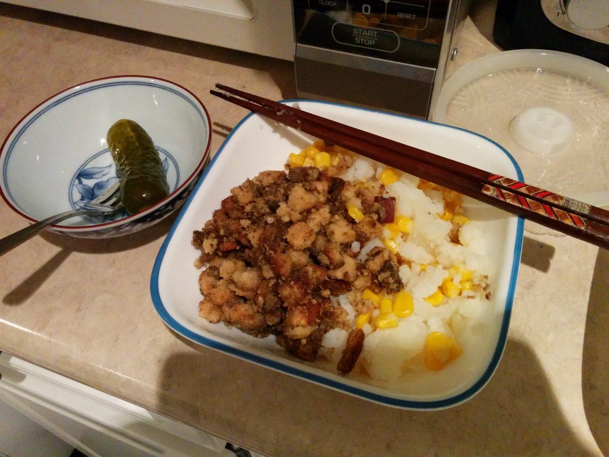 I am eating leftover vegetarian Thanksgiving with chopsticks. I don't even know what to hashtag this with.